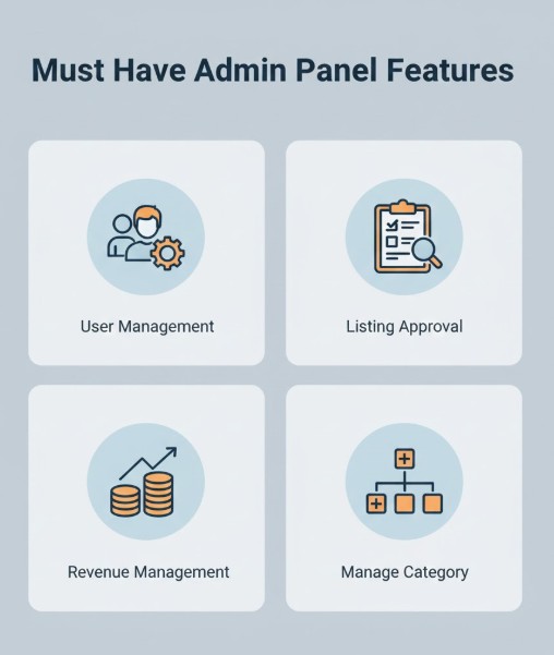 5. What admin panel features are essential for managing an OLX clone marketplace?